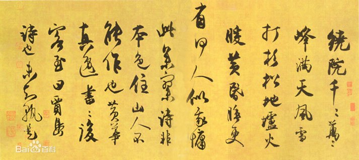 《李山画风雪杉松图卷跋》释文:绕院千千万万峰,满天风雪打杉松。地炉火暖黄昏睡,更有何人似我慵。王庭筠《李山画风雪杉松图卷跋》,(画)29.7×79.2cm,(全幅)31.2×1003.4cm。墨迹纸本,共十一行,六十字。现藏美国华盛顿弗利亚美术馆。王庭筠书法宗米芾,行笔疾速,富于变化。但不尽是米芾的风格,有他其自身的特点,书写作风十分严谨。用笔中锋、侧锋并使,点线丰腴厚实,绝少枯笔飞白;笔致俊逸,神气超迈。章法方面,这幅字首尾布白相应,行距匀称妥贴,对行与行的处理,注意揖让呼应,达到相安相得。年代为估计