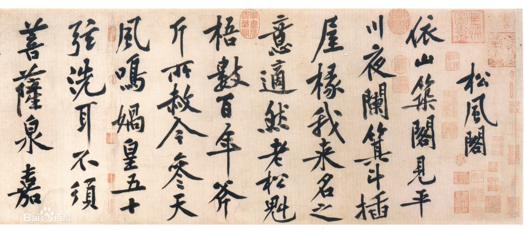 《松风阁诗帖》是黄庭坚七言诗作并行书,墨迹纸本,纵32.8厘米 横219.2厘米,全文计29行,153字。台北故宫博物院藏。松风阁在湖北省鄂州市之西的西山灵泉寺附近,海拔160多米,古称樊山,是当年孙权讲武修文、宴饮祭天的地方。宋徽宗崇宁元年(1102)九月,黄庭坚与朋友游鄂城樊山,途经松林间一座亭阁,在此过夜,听松涛而成韵。依山筑阁见平川,夜阑箕斗插屋椽。 我来名之意适然。老松魁梧数百年,斧斤所赦今参天。 风鸣娲皇五十弦,洗耳不须菩萨泉。 嘉二三子甚好贤,力贫买酒醉此筵。夜雨鸣廊到晓悬,相看不归卧僧毡。 泉枯石燥复潺湲,山川光辉为我妍。 野僧旱饥不能饘,晓见寒溪有炊烟。东坡道人已沉泉,张侯何时到眼前。 钓台惊涛可昼眠,怡亭看篆蛟龙缠。 安得此身脱拘挛,舟载诸友长周旋。