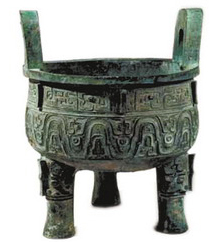 大克鼎是周孝王时大贵族克为颂扬国君、祭祀祖父所铸,形体巨大,高93.1厘米,重201.5公斤,口径75.6厘米,是仅次于大盂鼎的西周第二大青铜器。造型宏伟古朴,鼎口之上竖立双耳,底部三足已开始向西周晚期的兽蹄形演化,显得沉稳坚实。口沿饰兽面纹,腹部饰波曲纹,线条雄浑流畅。